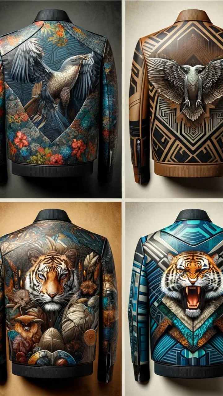 These jackets are crafted with precision, featuring unique print designs that range from abstract art to digital motifs,texture of high-quality leather.